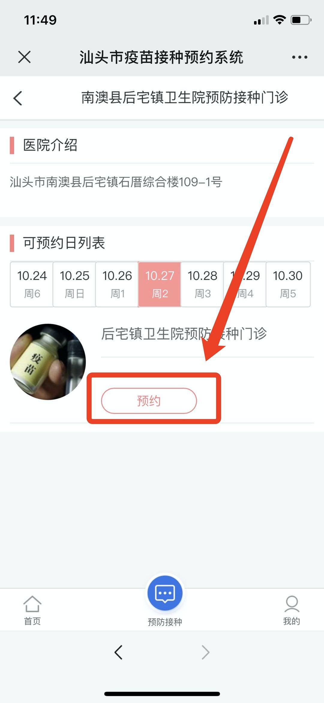 4.仔细阅读预防接种门诊告示后下滑,找到“预约”的红色按钮,点击进入。