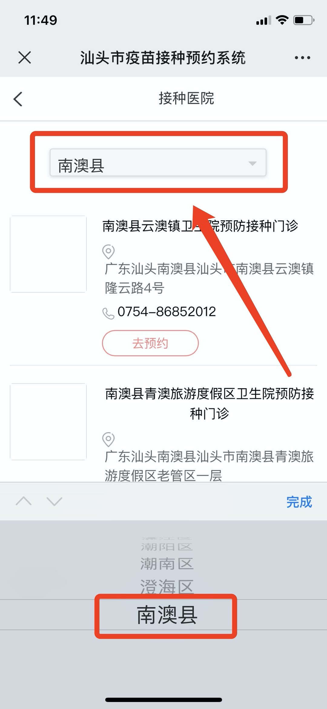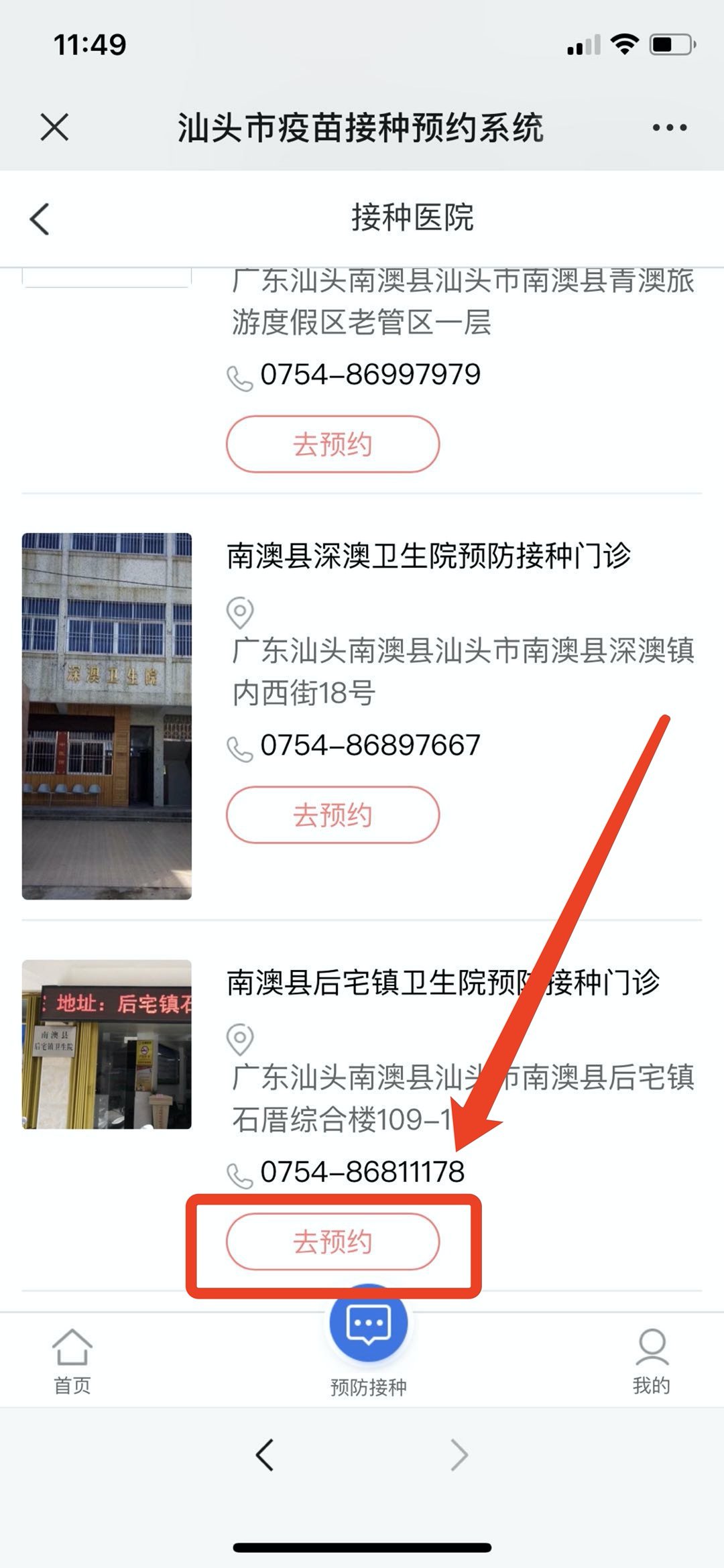 3.找到“南澳后宅镇卫生院预防接种门诊”点击红色按钮“去预约”。