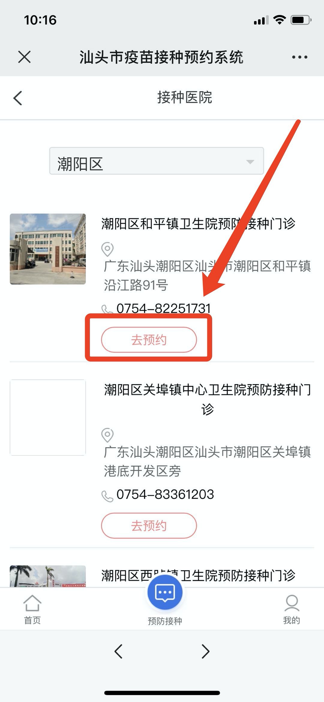 3.找到“潮阳区和平镇卫生院预防接种门诊”点击红色按钮“去预约”。