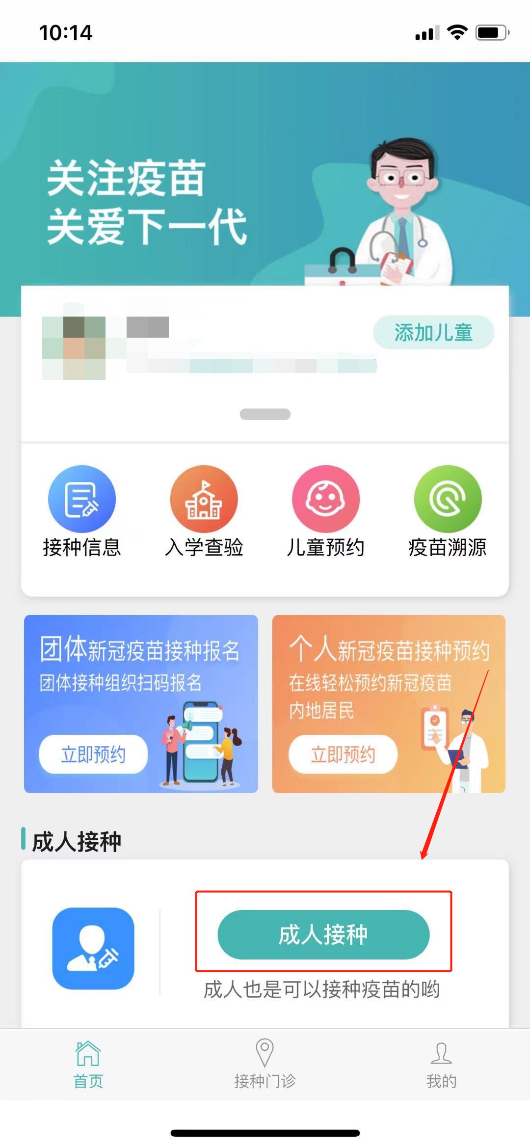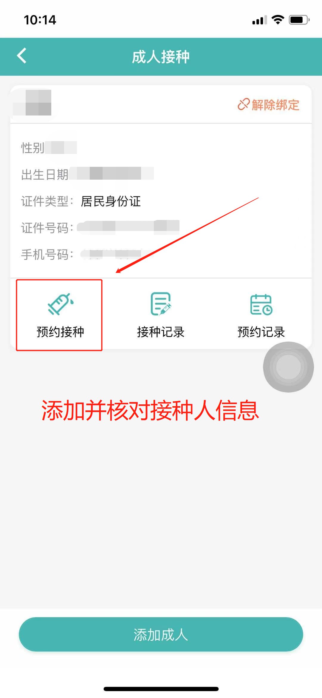第二步:点击首页的【成人接种】绑定成人接种的信息,注意核对信息是否正确。