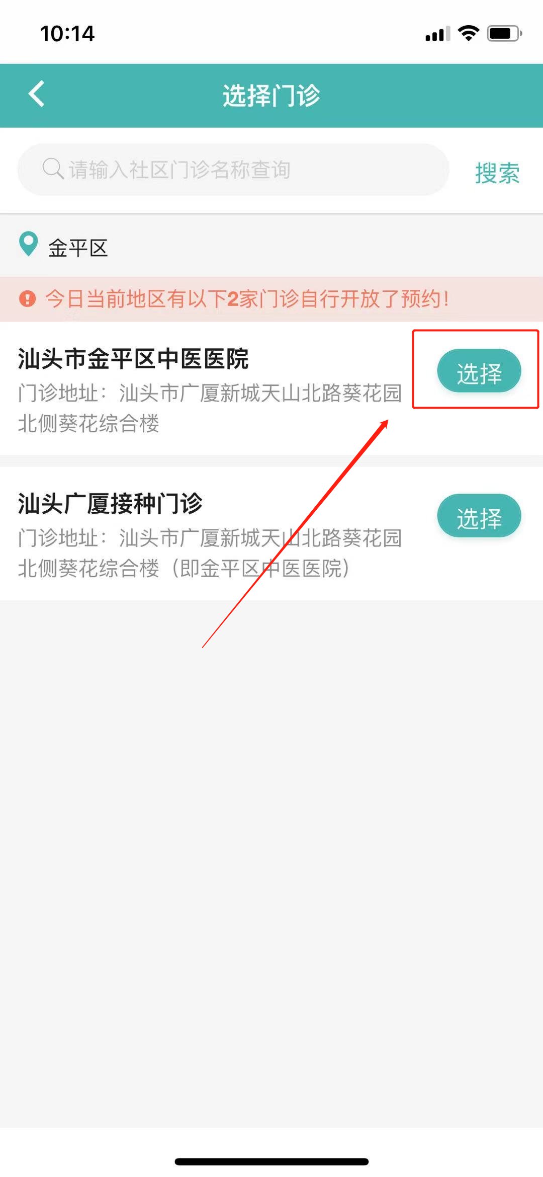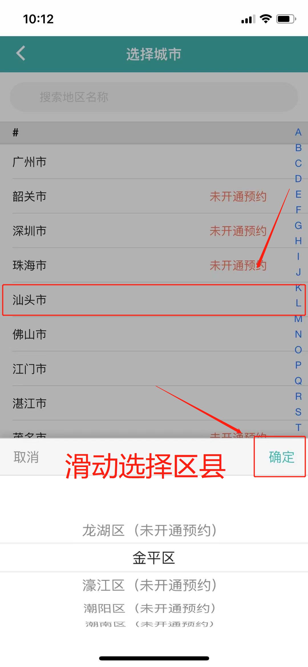 第四步:选择【汕头市】,滑动即可查看汕头市当前开放线上预约的区县门诊。