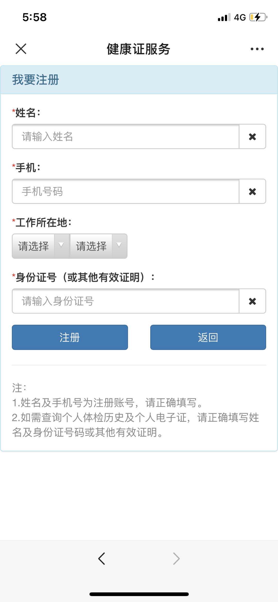 2.绑定个人的体检信息:点击右下方“我的”,选择“我的证明”,进入“我要注册”界面,输入体检登记时的个人信息进行注册。