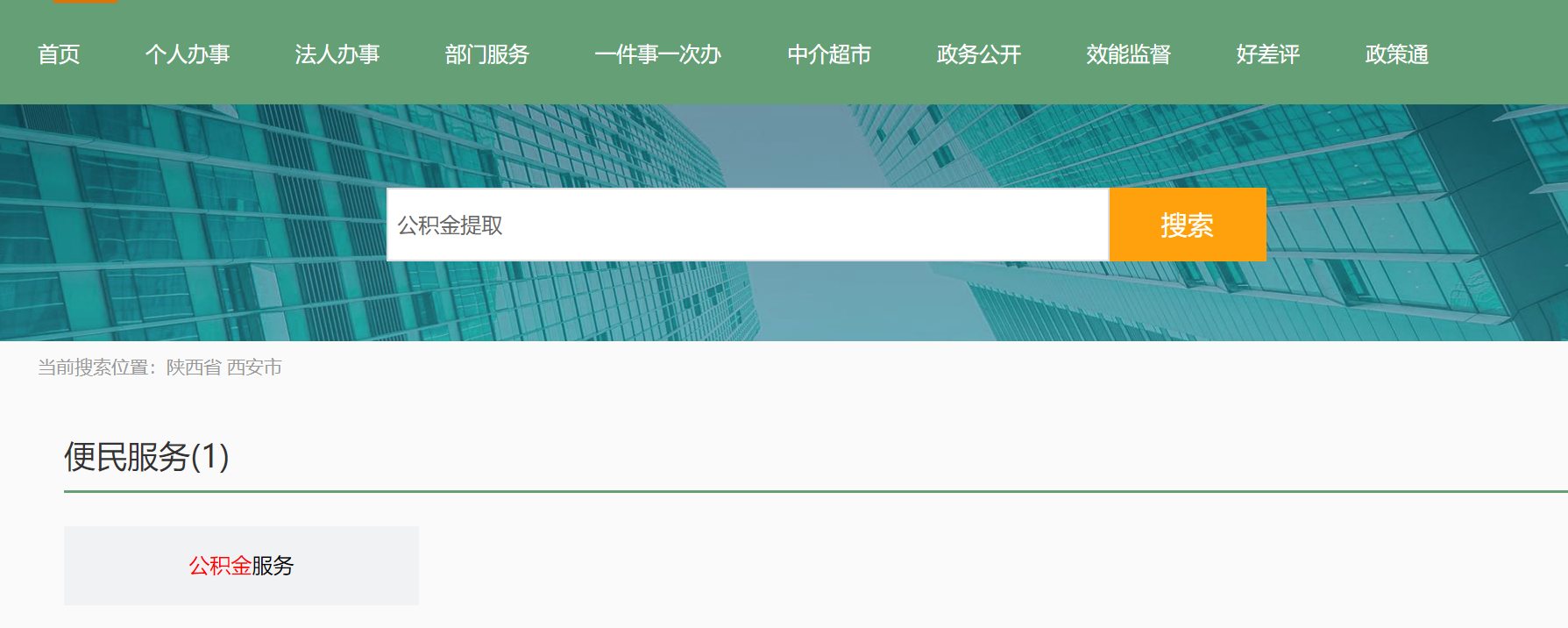 2、注册成功,完成个人登录后,在搜索框输入【公积金提取】,下滑到【政务服务】,可查看能线上提取的公积金种类。