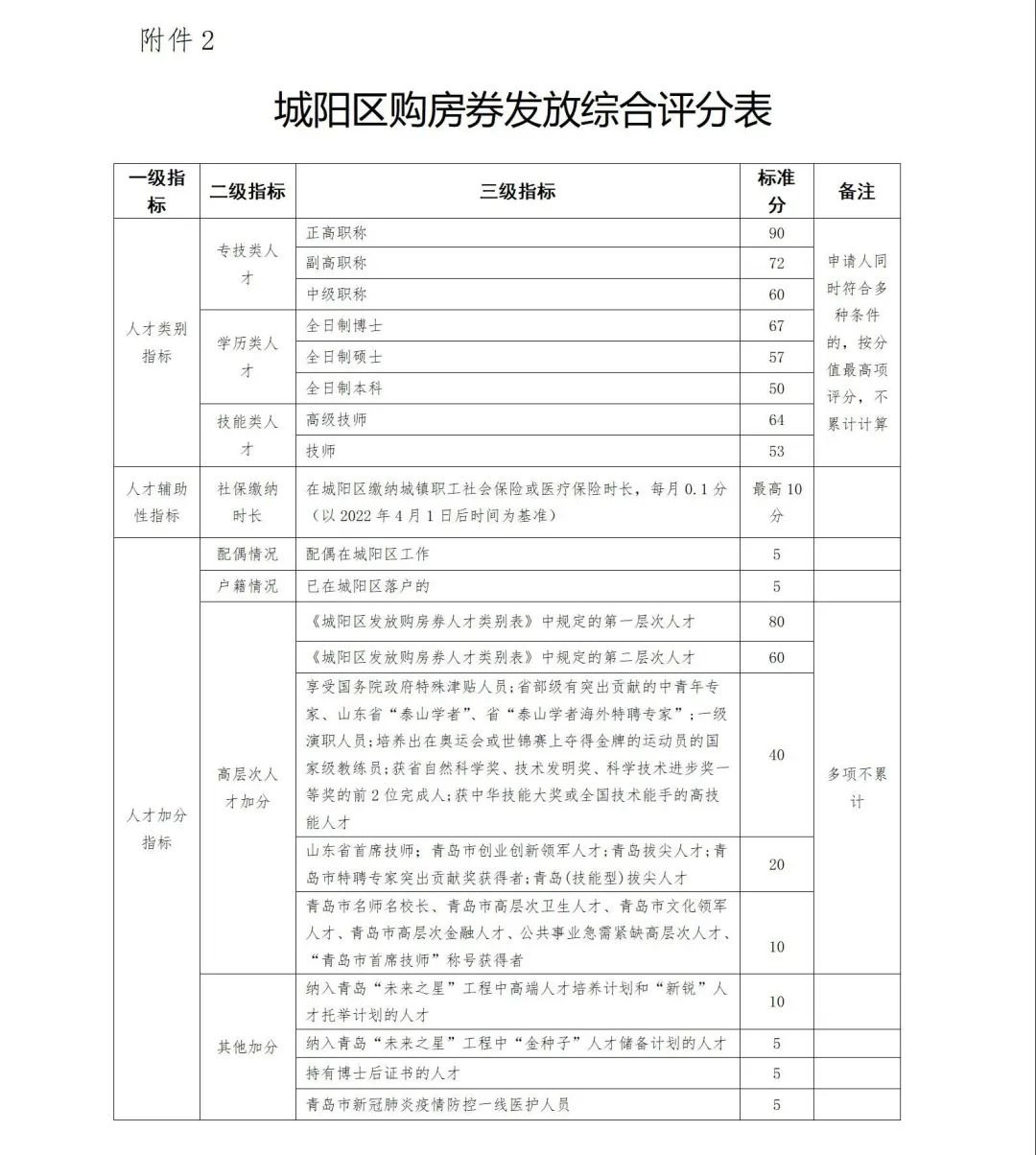 3、资格排序。购房券发放实行综合评分制,发放顺序按照《城阳区购房券发放综合评分表》(附件 2)各项分值合计,分数高者优先发放。分值相同的按照在青缴纳社保或医保时长排序,时间长者优先;社保或医保缴纳时长相同的,按照申请人年龄排序,年龄大者优先。