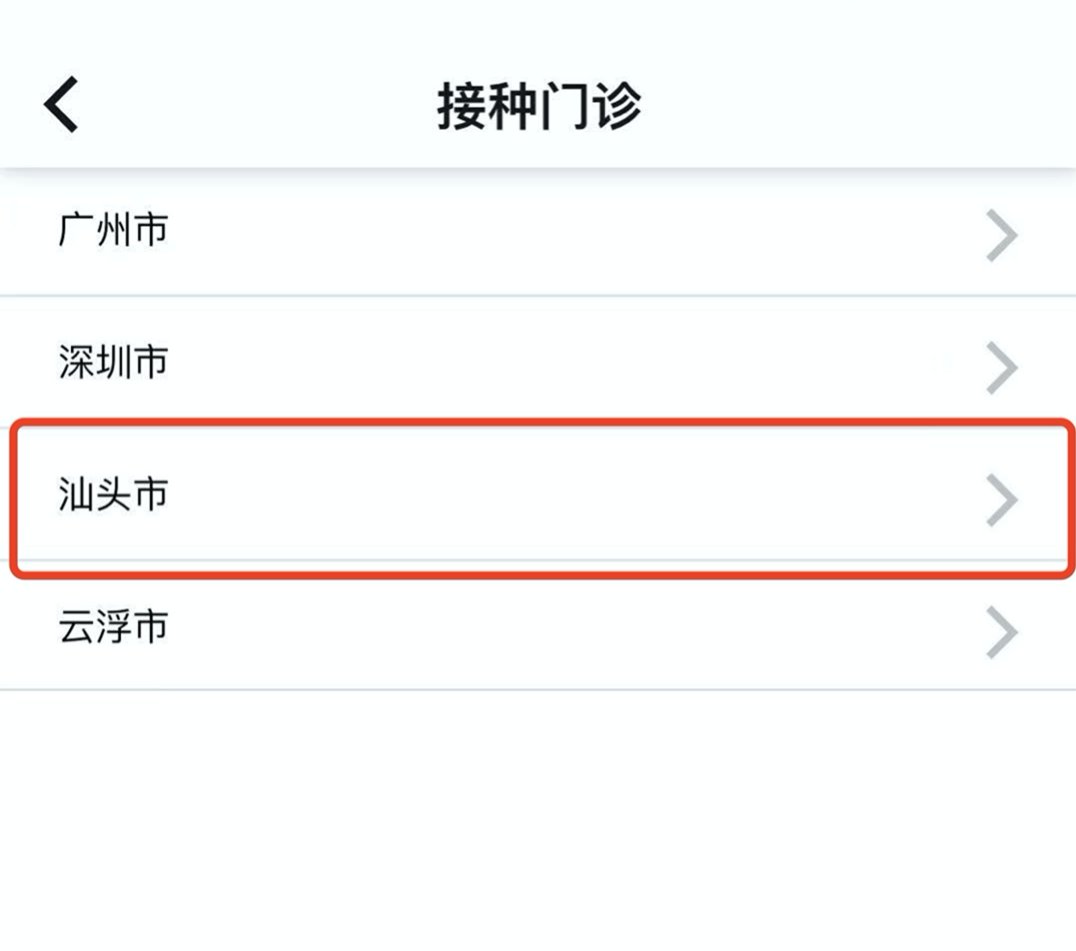 第四步:找到四价疫苗,点开查看是否有汕头市,如有表示目前汕头市有门诊有苗且开放预约,点击预约门诊选择对应时间段预约即可。如果点开没有汕头市则表示汕头市目前无门诊提供四价线上预约。
