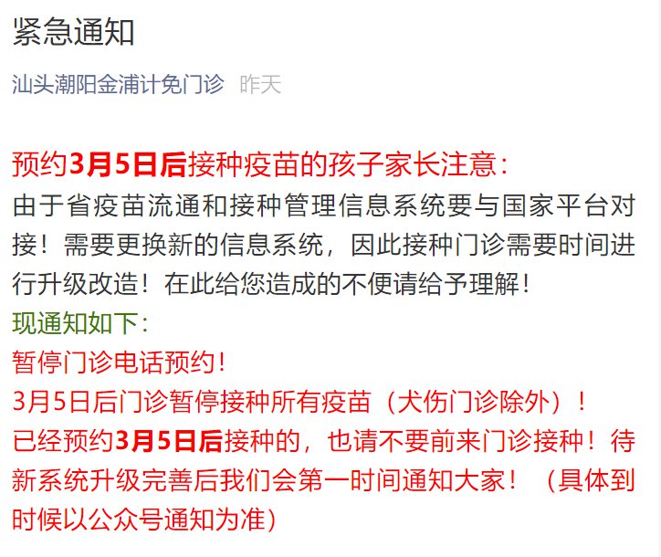 已经预约3月5日后接种的,也请不要前来门诊接种!待新系统升级完善后我们会第一时间通知大家!