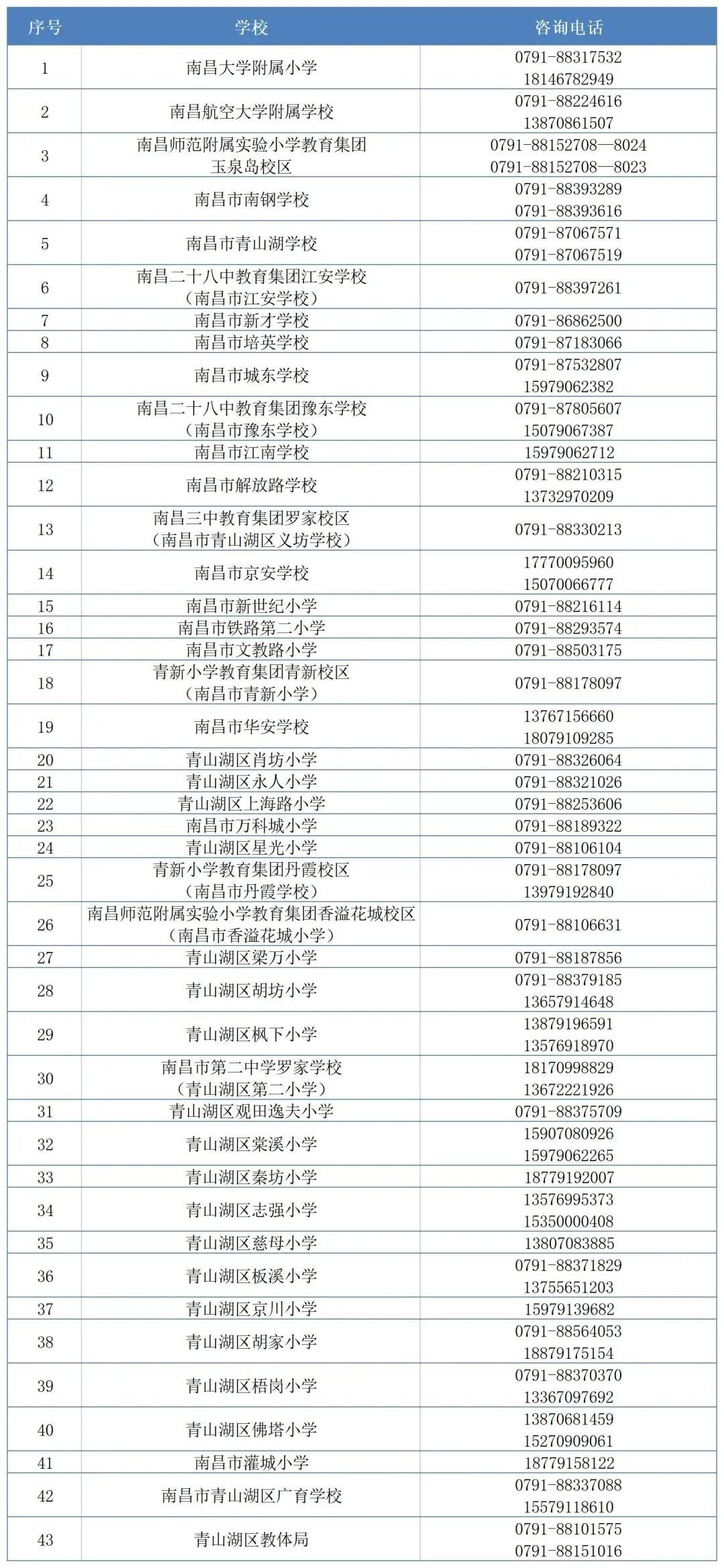 2.青山湖区2022年各学校招生咨询电话。