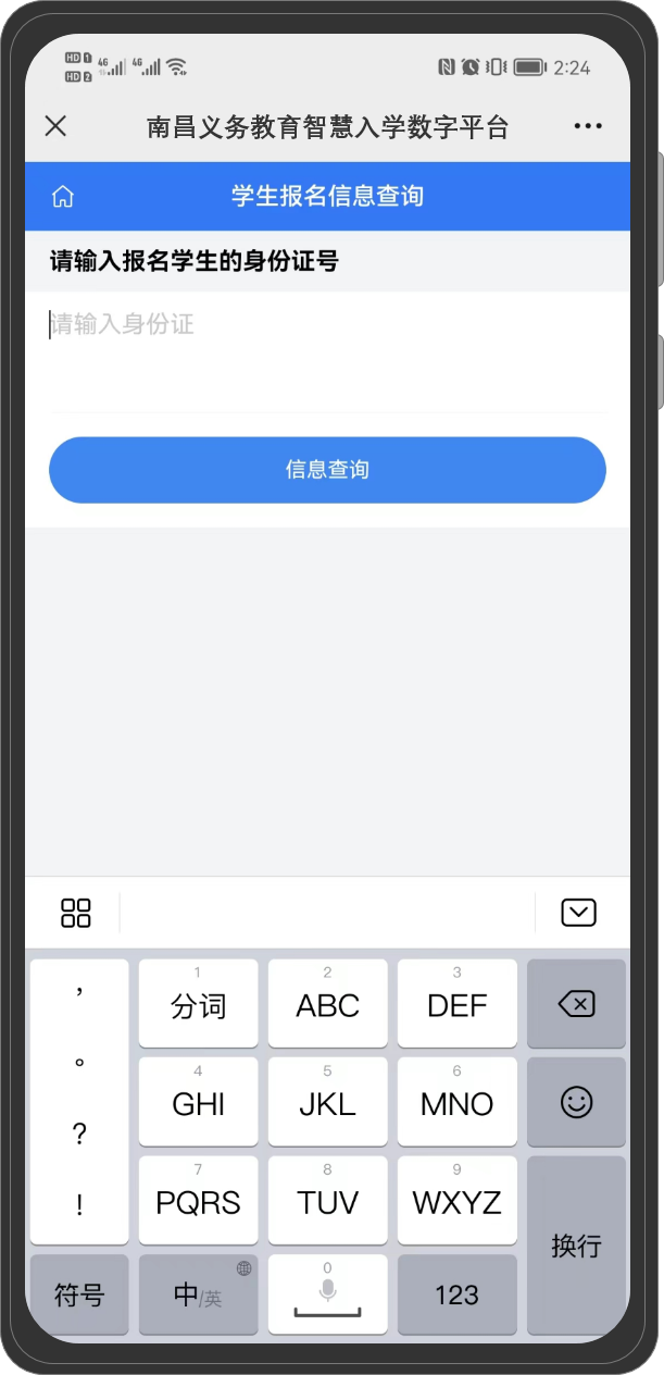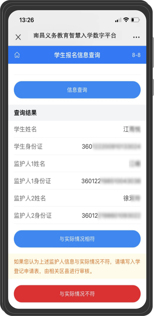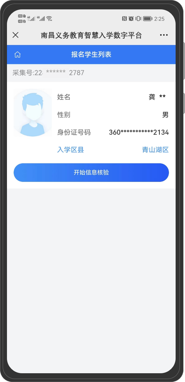 监护人输入学生身份证号进行信息查询,户籍查询通过后可查看学生基本信息,开始进行信息核验;