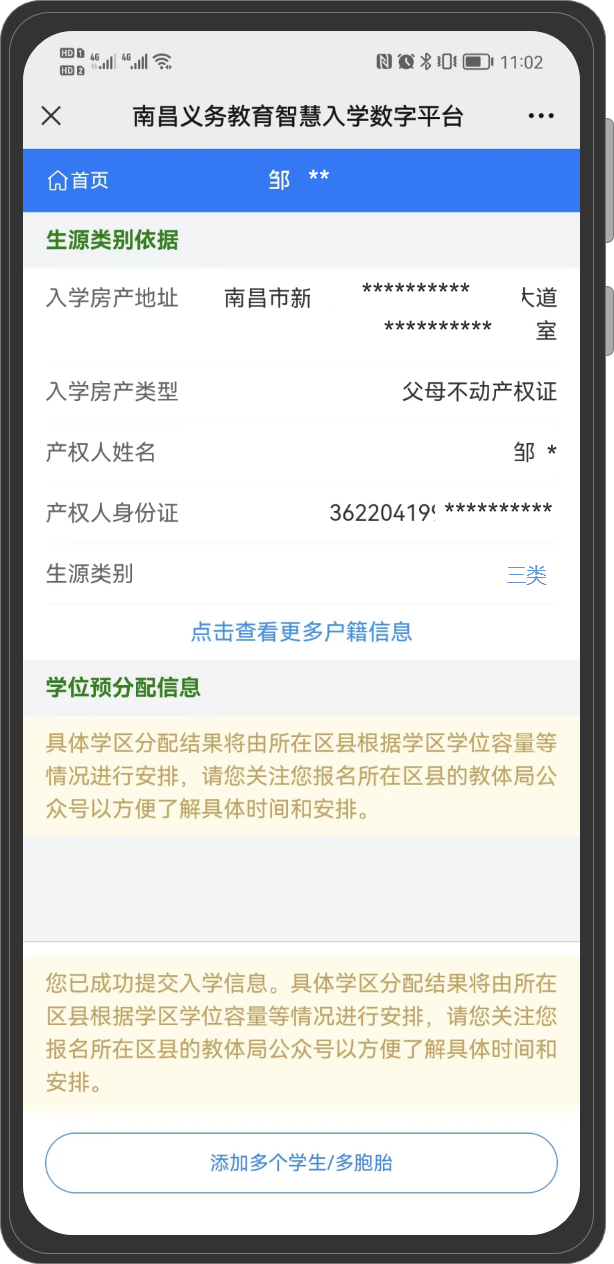 确认使用房产后可以查看生源类别,所属学区预览;保存入学信息后,如有多胞胎小孩可添加多胞胎入学信息;