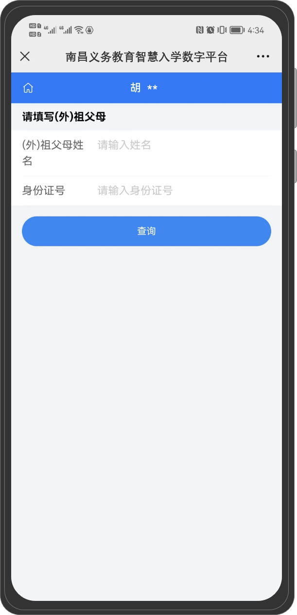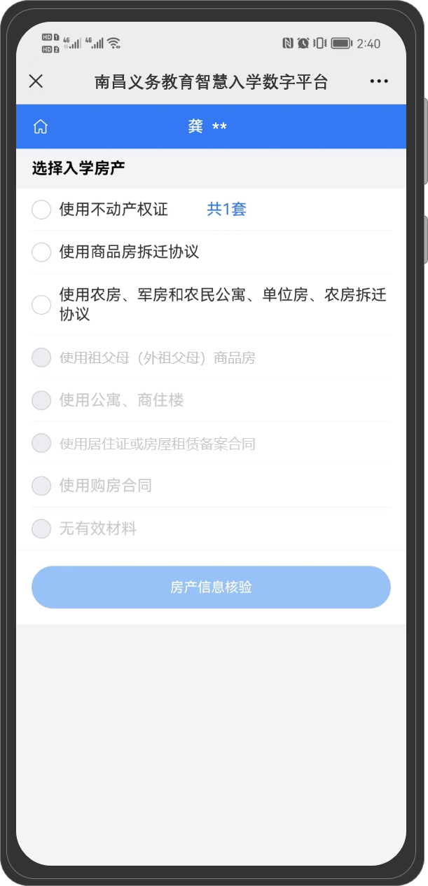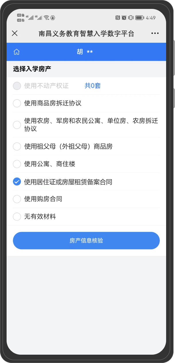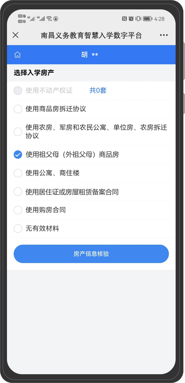 小学入学适龄儿童及父母南昌城区无房产,需提交(外)祖父母商品房房产,选择(外)祖父母商品房;查询成功需(外)祖父母进行人脸识别,通过后可使用(外)祖父母商品房房产;如(外)祖父母与学生不在一个户口本,需提交关系证明材料进行线上审核。
