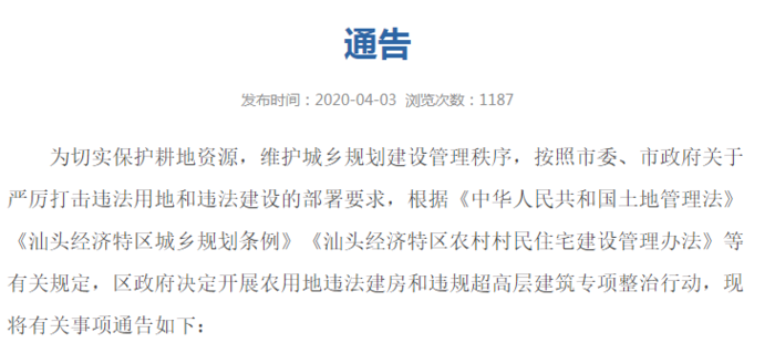 4月3日,澄海区发布通告,决定开展农用地违法建房和违规超高层建筑专项整治行动。