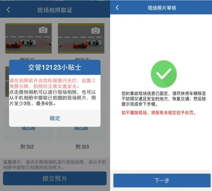 第二步:点选“录入事故”,拍摄3~6张照片取证并上传,交警后台审核。点击查看: