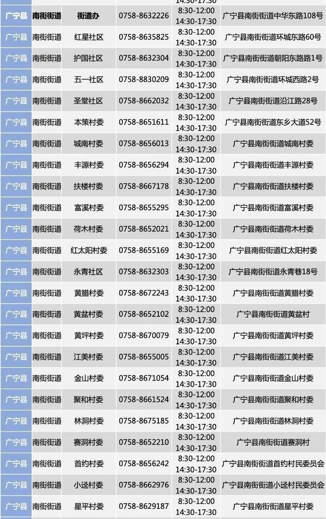 肇庆广宁县南街街道各村社区防疫报备咨询电话如下