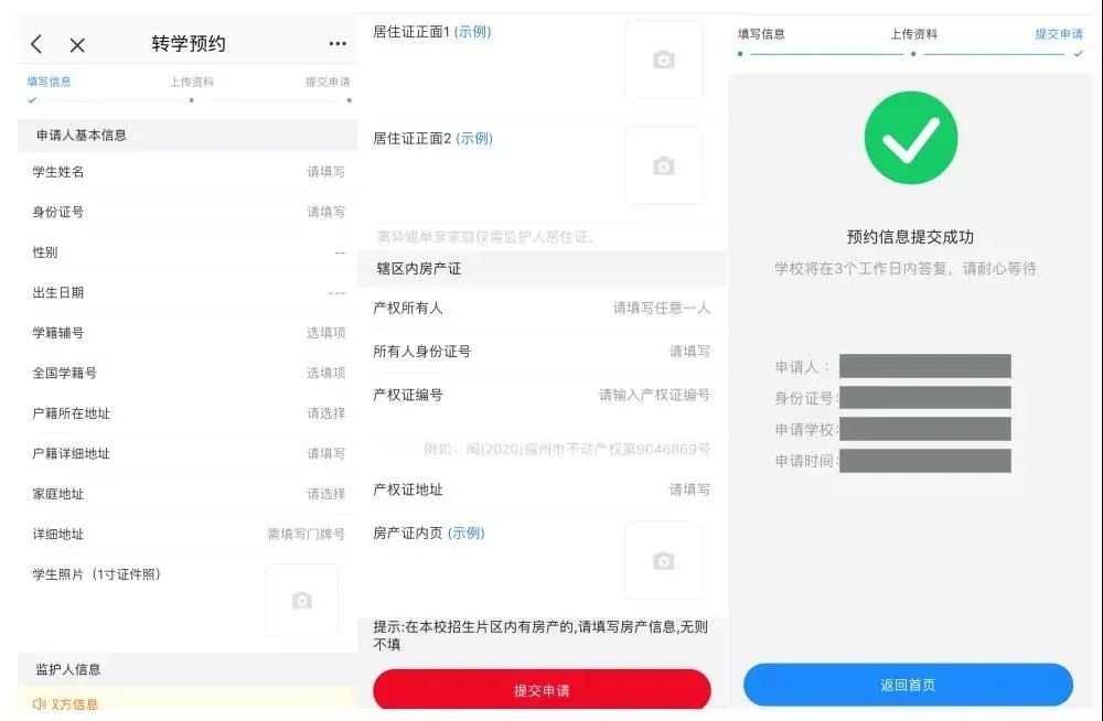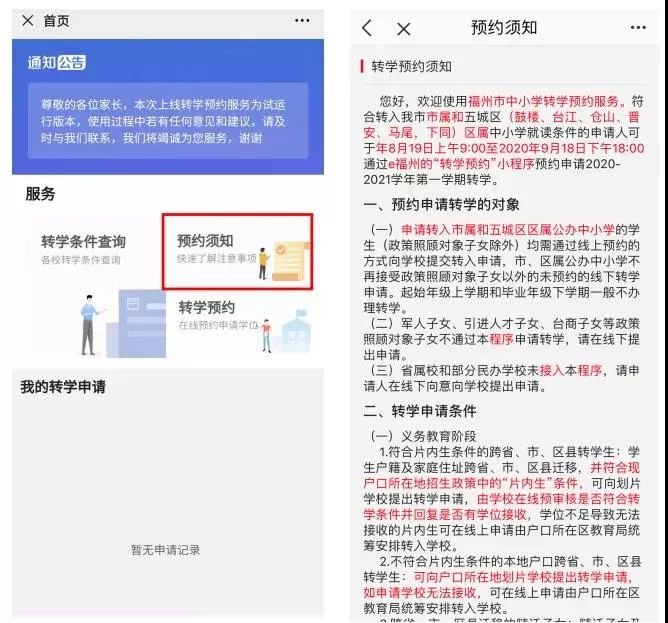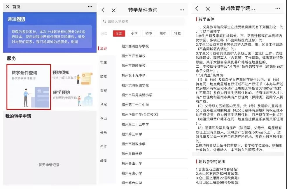 5.学校一般会在3个工作日内答复,请及时通过短信和e福州的消息提醒关注转学申请预审核情况,预审核成功且有学位的按照学校指定的时间、地点携带相关材料进行线下办理;若符合转学条件但没有学位,可以在线上向区教育局申请统筹安排或向其他学校发起转学申请。