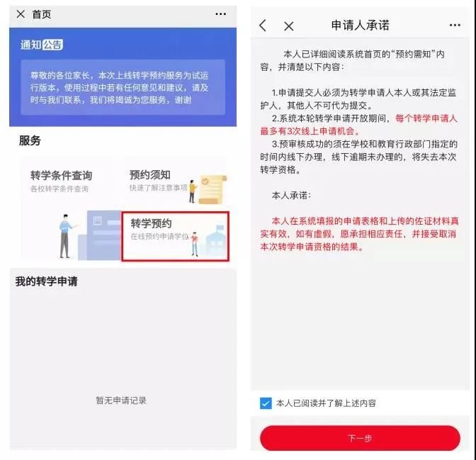 3.点击首页的“转学预约”,阅读“申请人承诺”并勾选“已阅读”选项,点击下一步。