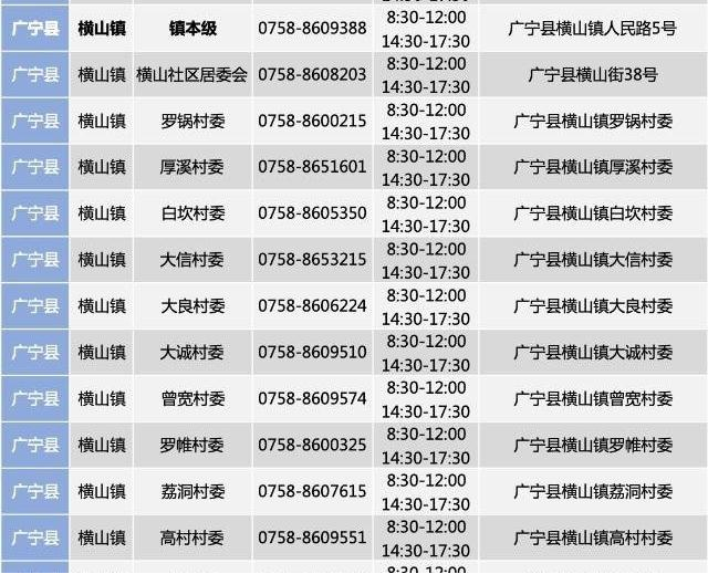 肇庆广宁县横山镇各村社区防疫报备咨询电话如下