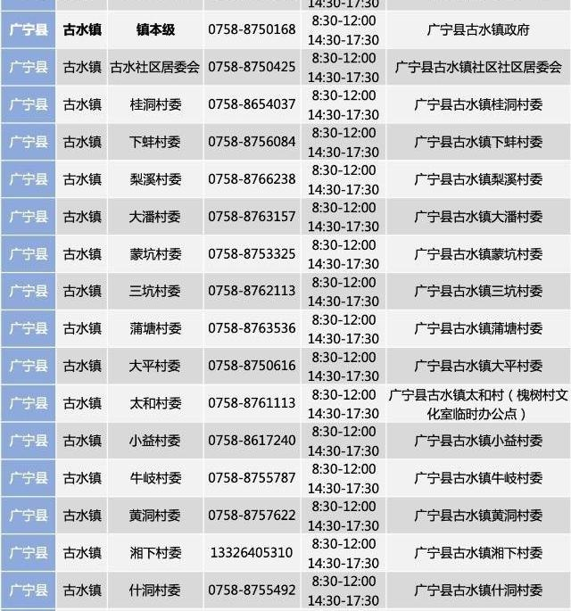 肇庆广宁县古水镇各村社区防疫报备咨询电话如下