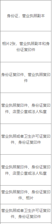 1、辖区企事业单位《营业执照》、《食品生产经营许可证》、《卫生许可证》等任一有效资质复印件一份;