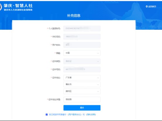 系统自动跳转到以下页面,补充“证件地址”信息后,点击“提交”如下所示: