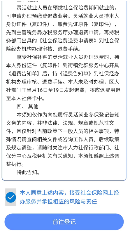3、阅读“灵活就业人员参保须知”,勾选“本人已同意”,点击“前往登记”。