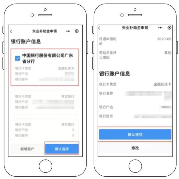 ❺ 进入【银行账户信息】页面,系统自动默认失业补助金发放至参保人员的社保卡金融账户(如无社保卡金融账户,可自行填写),信息确认无误后,点击【确认选择】。