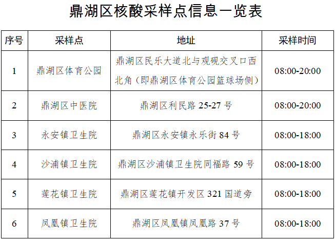 (二)地点:全区共设6个核酸采样点。三、注意事项(一)请检测对象按照通知要求,携带身份证及行业主管部门提供的《鼎湖区重点行业一线人员免费核酸检测凭证》,分时段有序就近前往采样点进行采样。