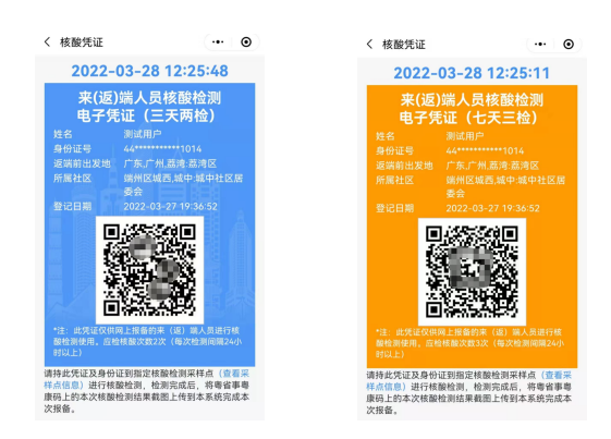3、报备群众根据社区返回的审核结果进行下一步的健康管理措施,如属于“应检尽检”中的7天3检或3天2检人员,系统会发放对应核酸检测电子凭证(凭证样式如下):