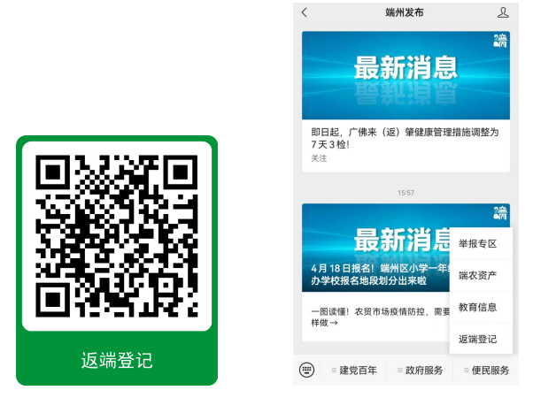 端州区外来(返)端人员可微信扫一扫“返端登记”专属二维码或通过“端州发布”公众号—便民服务—返端登记进行网上报备。