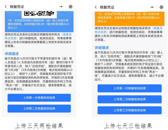 如属于“应检尽检”中的7天3检或3天2检人员,在每次核酸检测后要及时将本次核酸检测结果上传回系统,上传按钮在核酸检测电子凭证下方,如图:
