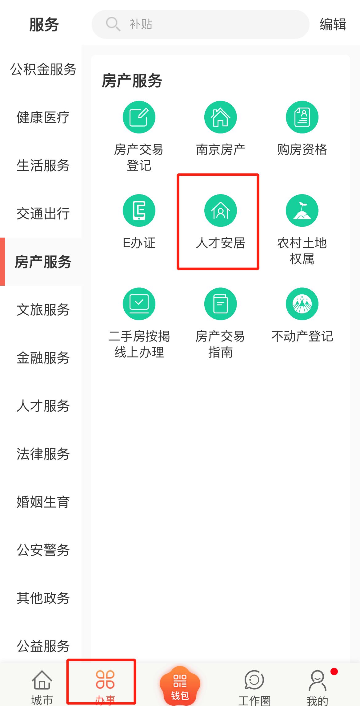 一、【我的南京APP】:进入“办事”——“房产服务”板块进行人才安居申请。
