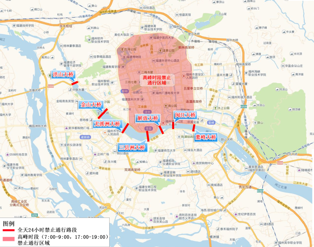 2、高峰时段(7:00-9:00,17:00-19:00)禁止在鼓楼、台江、晋安区二环(不含)以内区域道路通行。