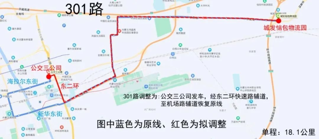 2.301路调整方案为:公交三公司发车, 经东二环快速路辅道、机场路辅道,原线运营,不再途经海东街、丝绸之路大道、新华东街,调整线路图如下: