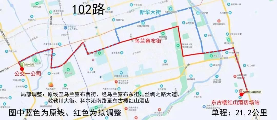 1. 102路调整方案为:原线至乌兰察布西街、经乌兰察布东街、丝绸之路大道、敕勒川大街、科尔沁南路至东古楼红山酒店,调整线路图如下:
