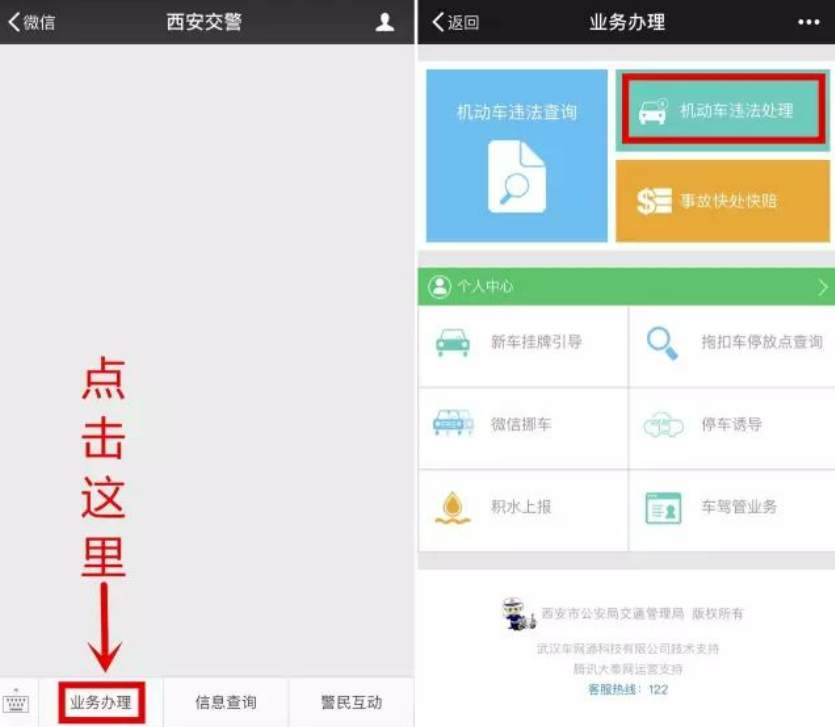 第一步:在“西安交警”微信公众号【业务办理】板块点击【机动车违法处理】,如下图所示: