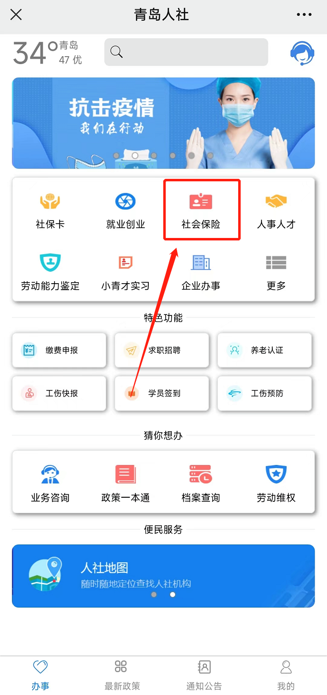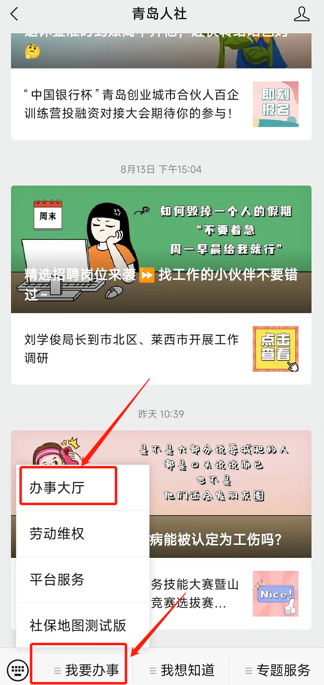 1、进入青岛人社公众号,选择“我要办事”—“办事大厅”