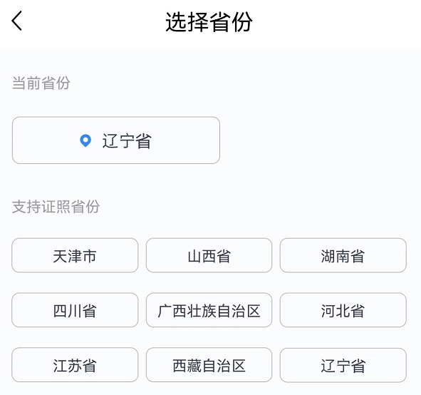 进入APP后需要选择证照签发的省份【辽宁省】。