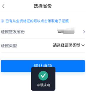 实名认证后的用户点击从业资格证申领,进入证照申领页;选择证照签发省份和对应的证照类型后,点击确认申领,完成证照申领并进入证照列表。