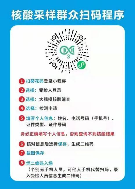 3.请广大市民群众严格按常住地址所属街道的安排,按期到就近的核酸采样点完成核酸筛查,以免造成人员聚集。