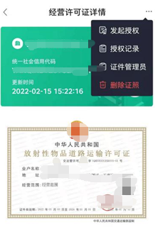 点击右上角呼出功能列表,点击证照授权,输入对应用户姓名、身份证、授权日期、授权事项给其他用户进行证照授权。