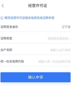 实名认证后的用户点击经营许可证申领,进入证照申领页。选择证照签发省份,进入对应省份的申领流程。输入对应经营许可证的统一社会信用代码、业户名称、证照类型后,点击领取,完成证照申领并进入证照列表。