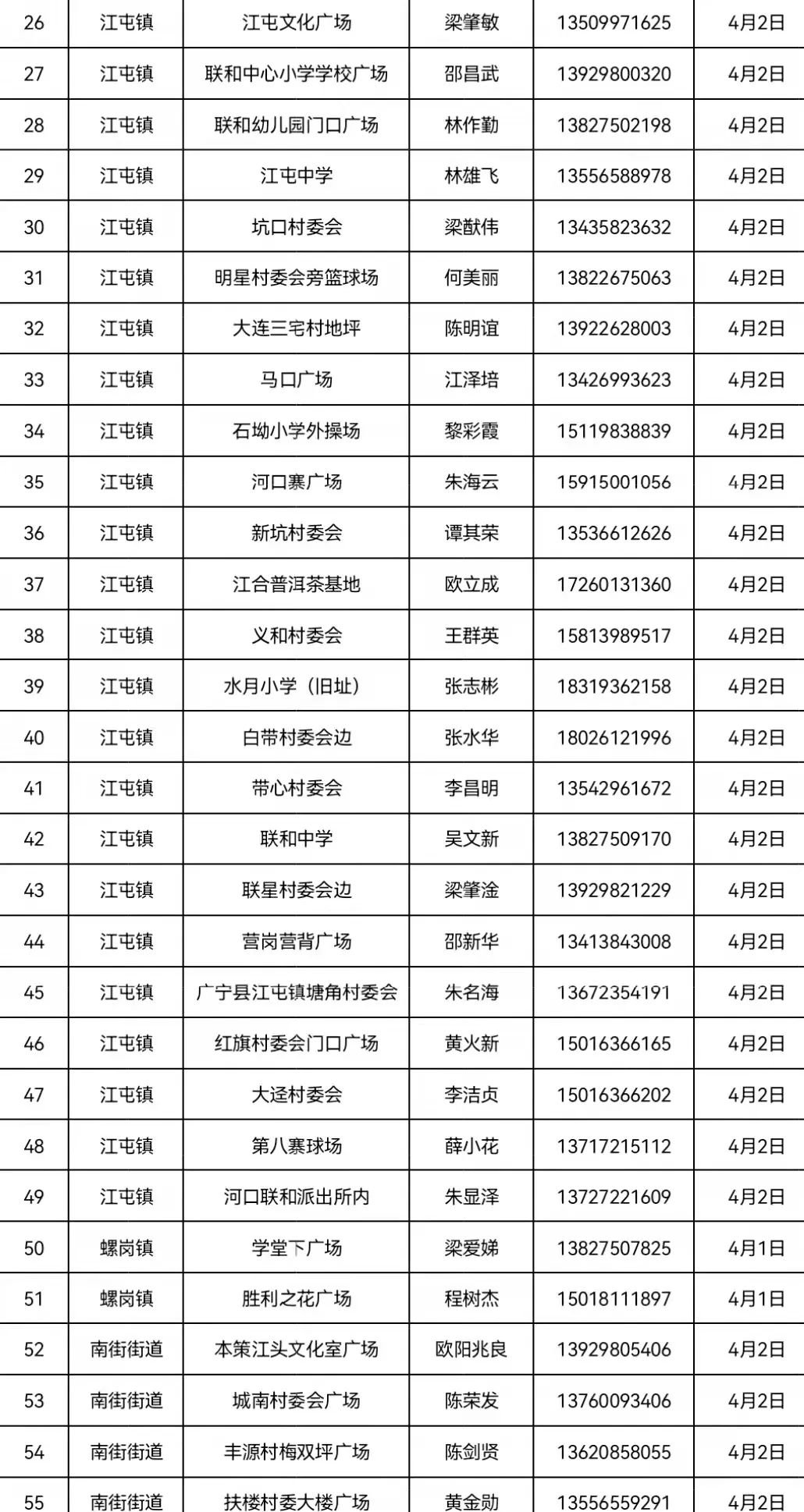 4月1日 江屯镇、潭布镇、螺岗镇辖区内居民和南街街道五大社区居民;