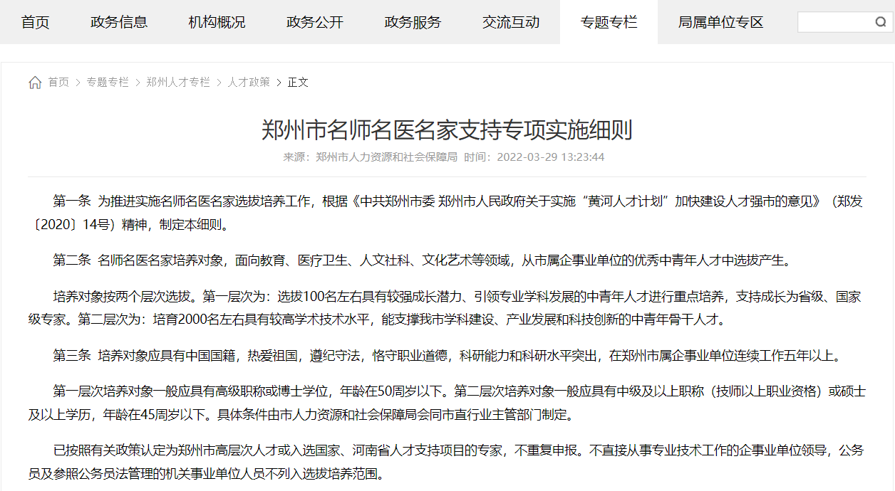 郑州市名师名医名家支持专项实施细则官方原文