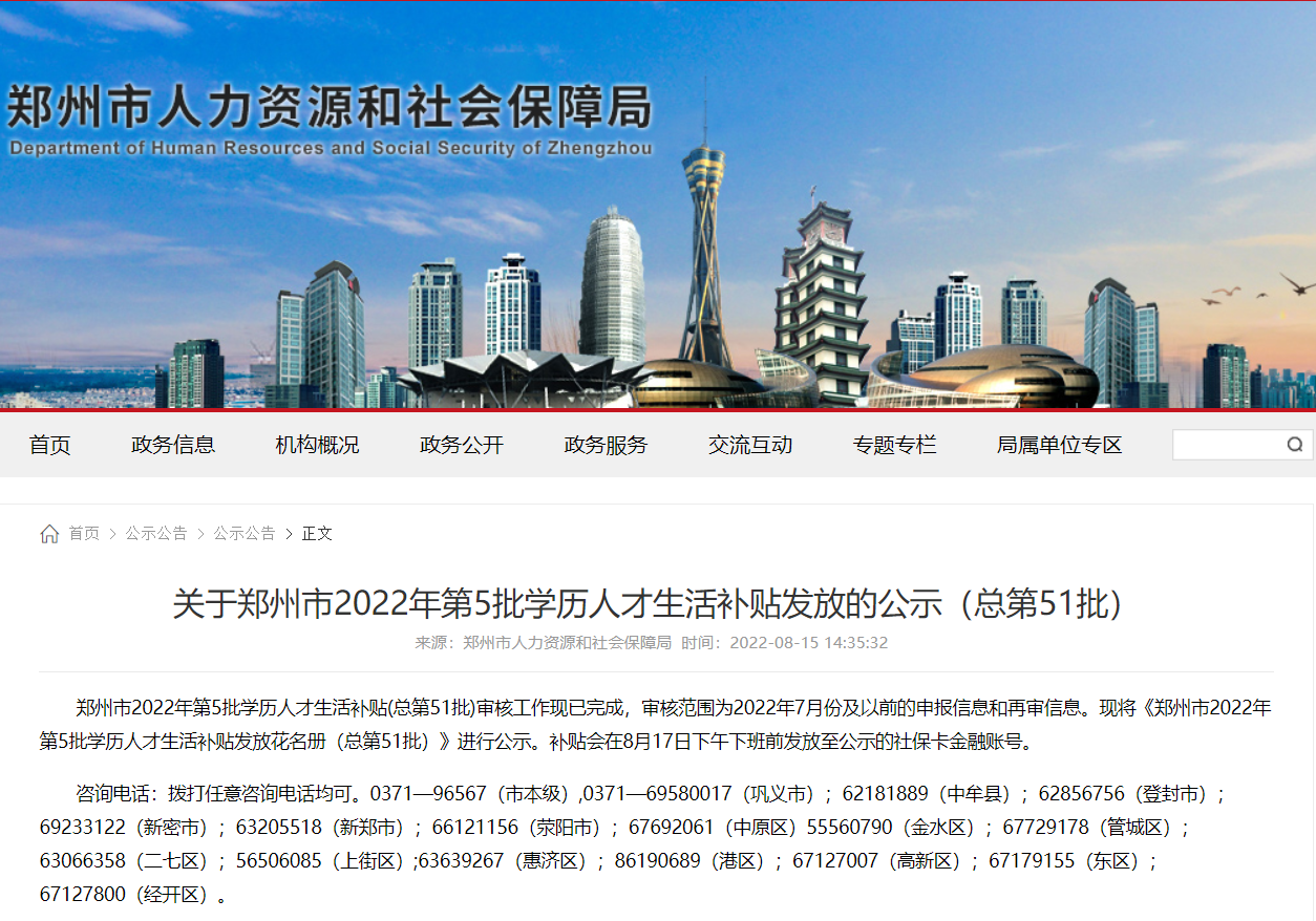 郑州市2022年第5批学历人才生活补贴(总第51批)审核工作现已完成,审核范围为2022年7月份及以前的申报信息和再审信息。现将《郑州市2022年第5批学历人才生活补贴发放花名册(总第51批)》进行公示。补贴会在8月17日下午下班前发放至公示的社保卡金融账号。