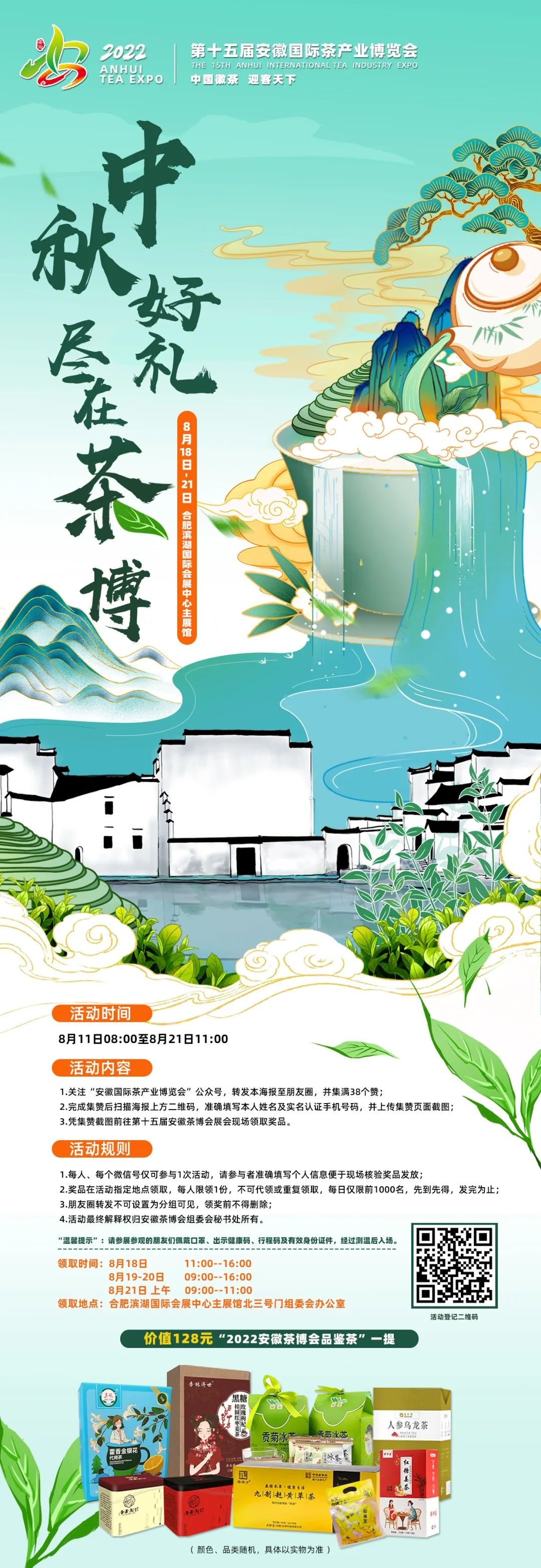 8月11-21日,组委会通过微信平台推出“中秋好礼 尽在茶博”品鉴茶活动,价值128元的茶博会品鉴茶礼已准备就绪!就等你来!快拿起你的手机转发下方活动海报或本篇推文至朋友圈参与吧!具体参与方式请点击下方活动海报查看,名额有限,先到先得!