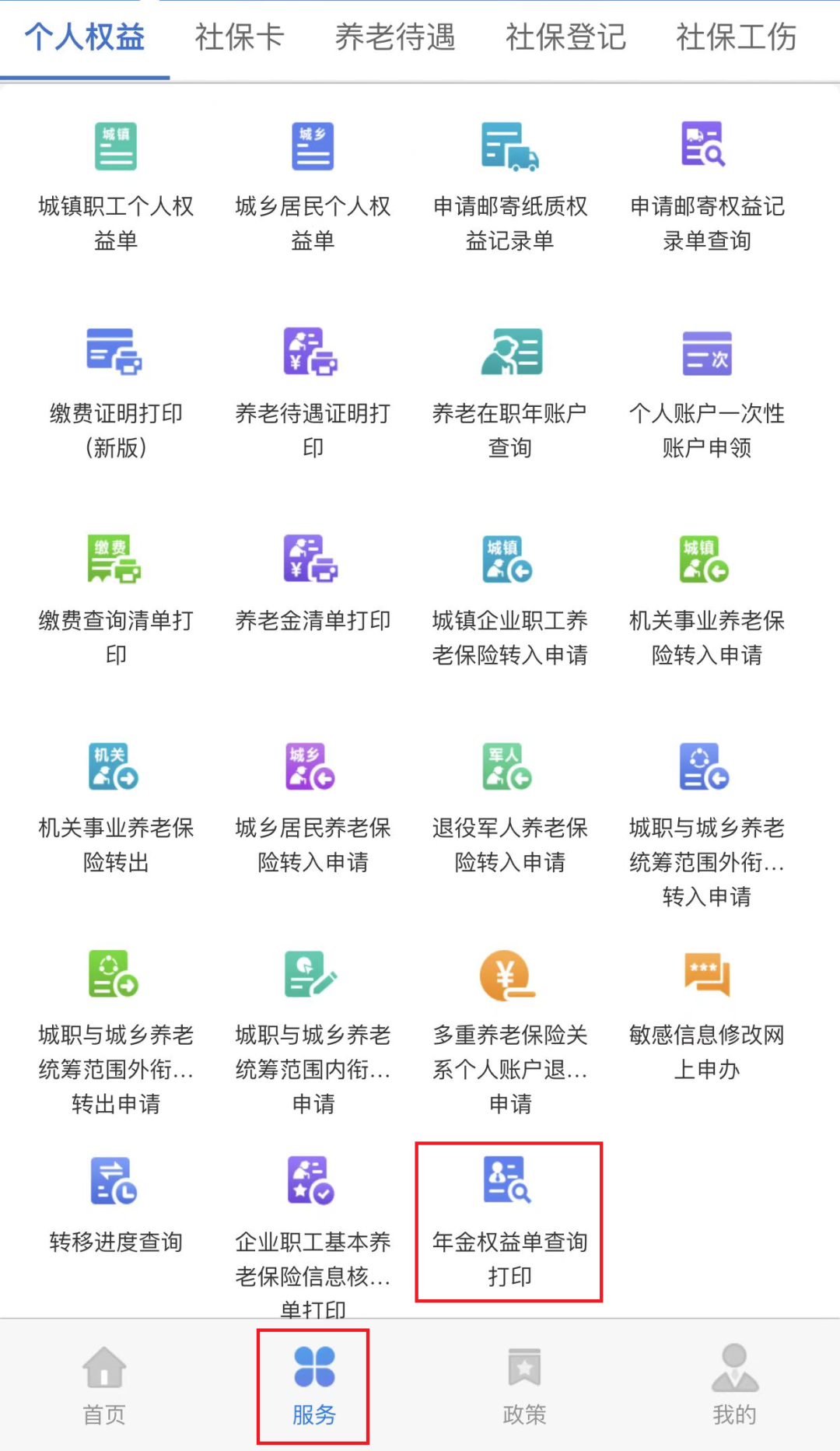 2、登录后,点击下方“服务”,在“个人权益”服务中选择“年金权益单查询打印”图标,进入打印页面。
