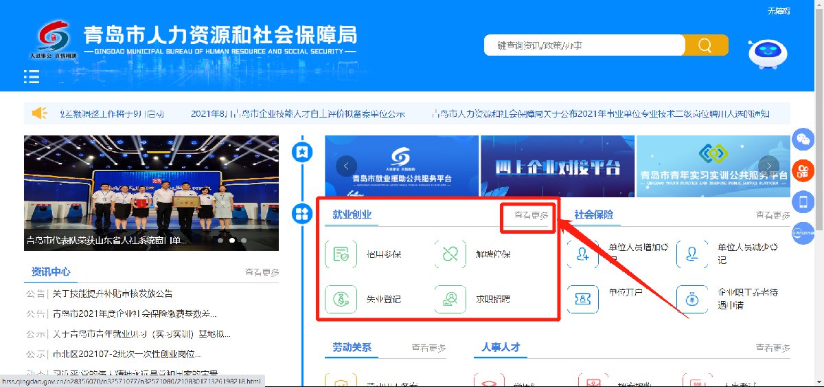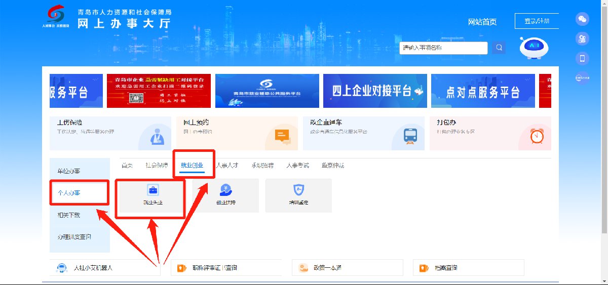 3)选择进入“个人办事”栏目下的“就业创业”模块,选择“就业失业”。