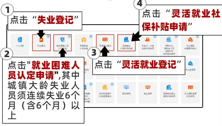4)点击“失业登记”进行失业登记办理;点击“就业困难人员认定申请”可申请就业困难认定;点击“灵活就业登记”进行灵活就业登记办理;最后点击“灵活就业社保补贴”,申请补贴。