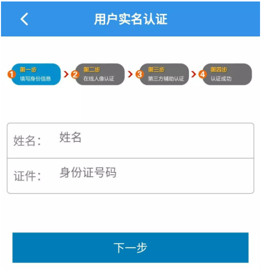 步骤6:进入个人中心,点击左下方实名认证按钮,进入后先按照要求填写个人身份信息,确认后进入“在线人像认证”功能,按照语音提示作出相应动作,通过实名认证。如活体人像比对认证无法正常通过,可进入“第三方辅助认证”页面填写自己名下已开通网银功能的银行卡号(借记卡、信用卡),且该银行卡预留的手机号与平台注册手机号一致,即可认证成功。