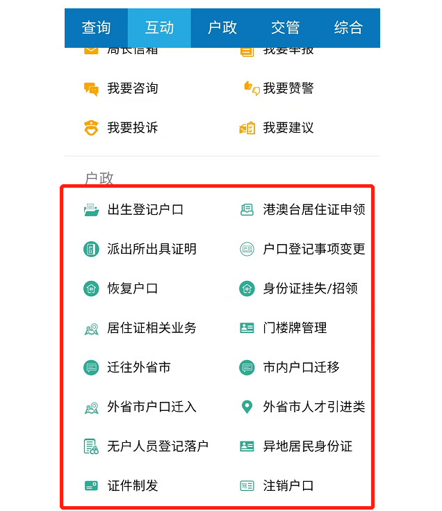 步骤7:在首页中部位置找到“户政”,根据自身情况点击相关项目,办理户籍转入转出相关事项。