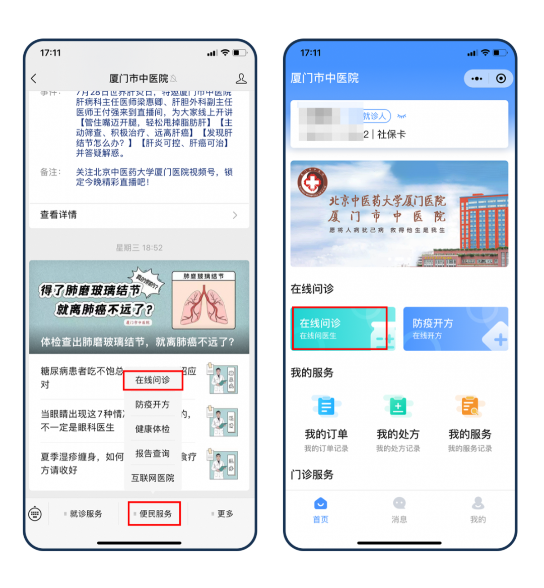 点击菜单栏【便民服务】-【在线问诊】,进入厦门市中医院互联网医院首页,点击【在线问诊】。